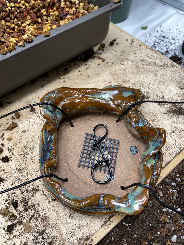 Now the final step for smaller trees is to add more bonsai soil on top of the root ball and tie down wires. The soil should come just to the top edge of the pot.