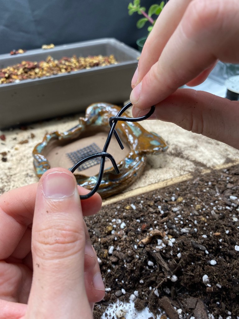 Now make another one going the other direction. It’s critical that the distance between where each loop goes back over the wire is the same as the diameter of the hole in the pot. Both should go over the wire.