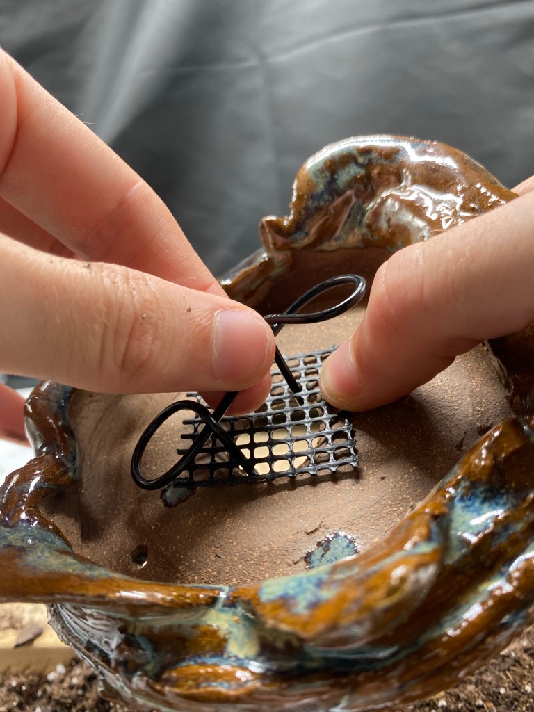 Place the mesh over the hole (on the inside of the pot) and poke the wire ends down through it at the very edges of the hole.